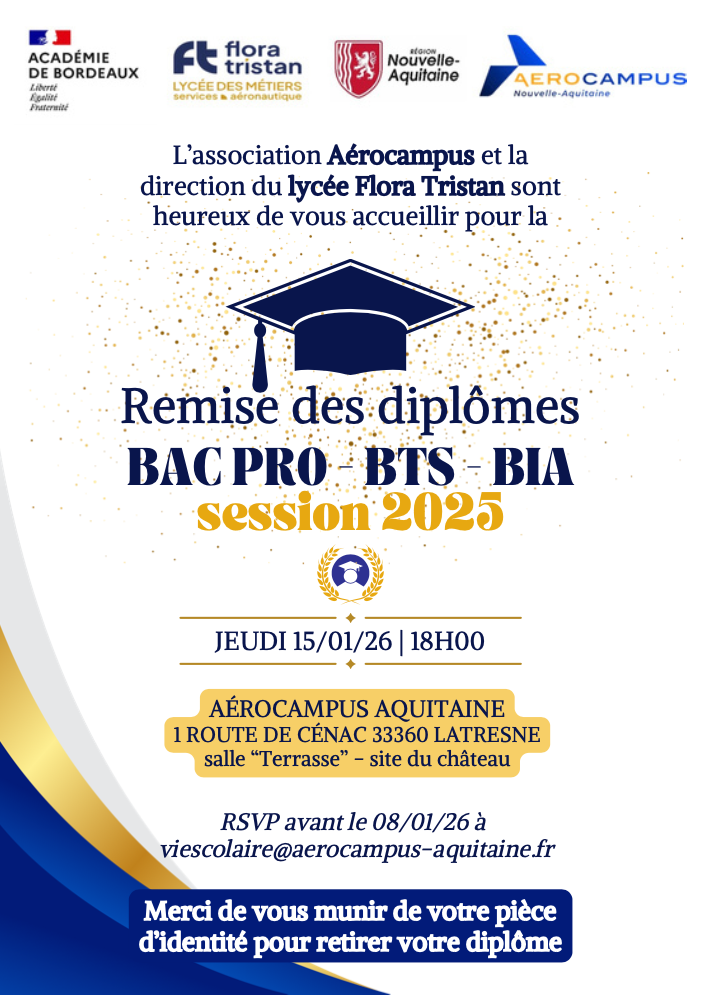 Le 15 janvier 2026 a eu lieu la traditionnelle soirée de remise de diplômes des élèves des sections aéronautiques du lycée Flora Tristan en partenariat avec AEROCAMPUS