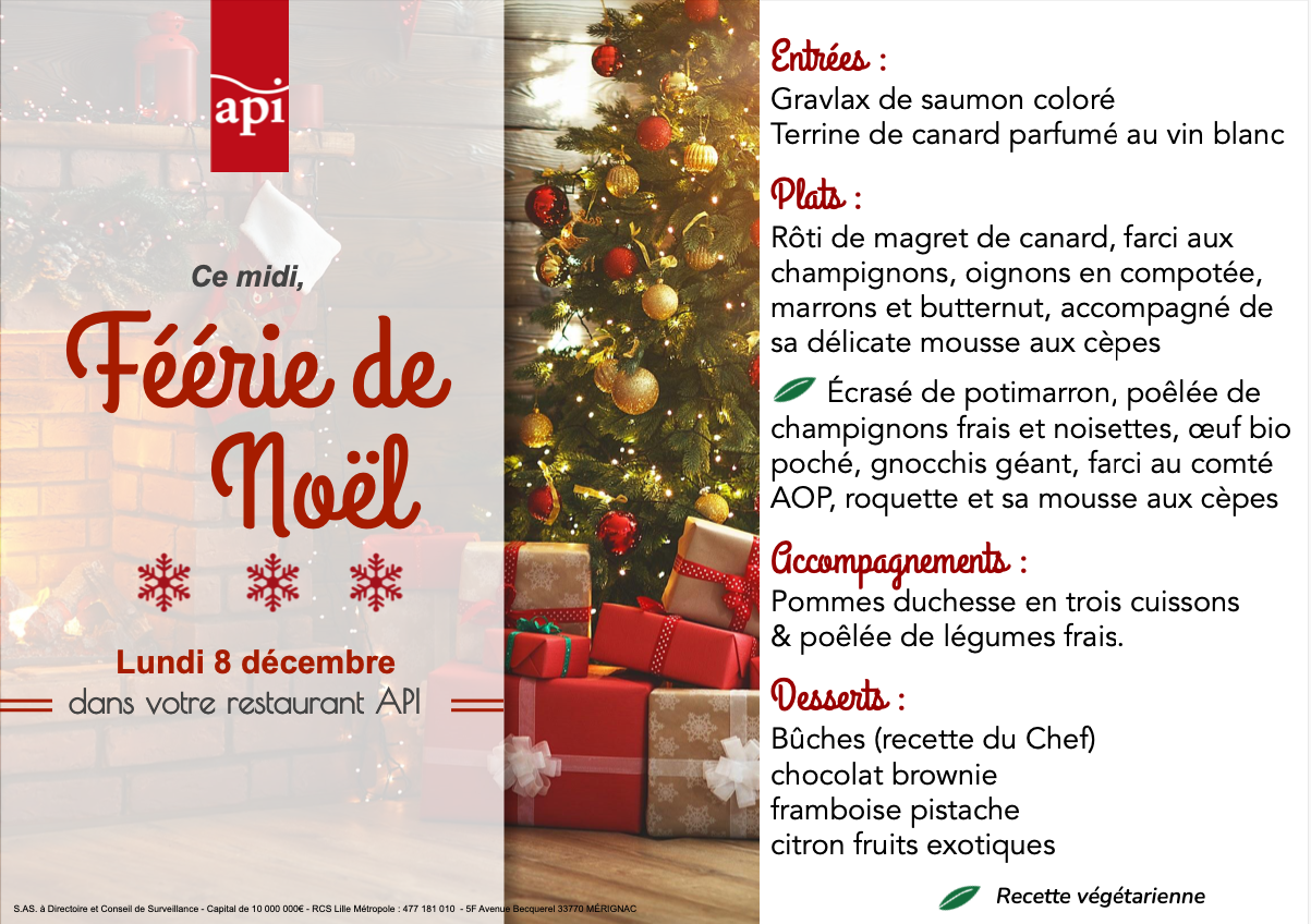Repas de Noël festif à l'Aerocampus préparé par le service de restauration API